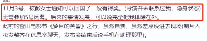 她透露,11月3日,制片人彭女士单方面通知她“未获奖,无需参加5号闭幕式,可以回国”。反观导演张律则全程“隐身”,从未有过任何沟通。