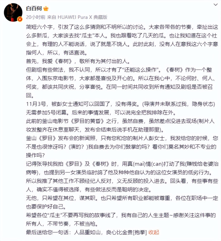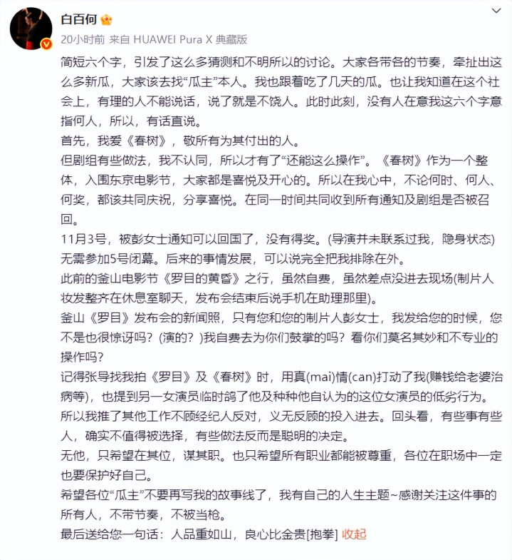 11月6日,白百何在社交平台发布千字长文,不再隐忍,正面硬刚《春树》剧组的不公待遇。