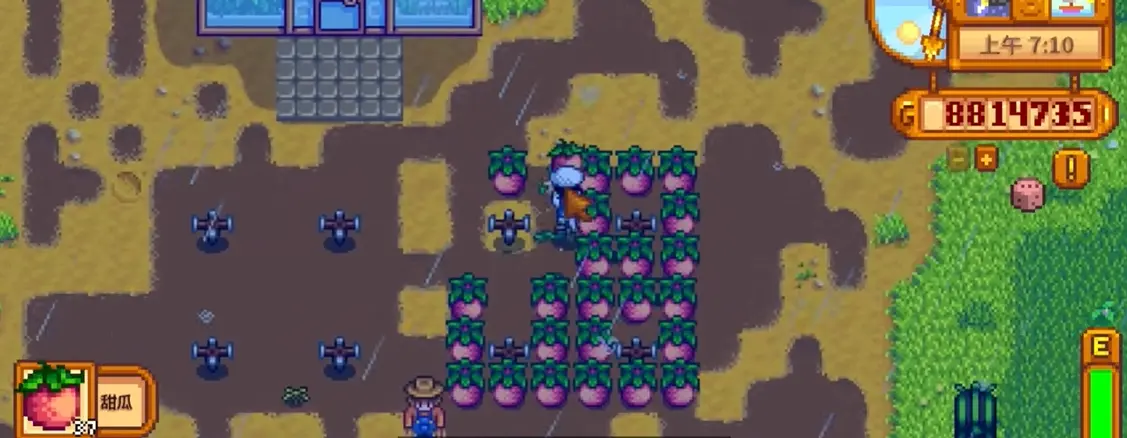 最后补充两个夏季生存技巧:一是防暴风雨,7 月 13 日和 26 日大概率刮暴风雨,提前在农场放 3-5 个避雷针(铁匠铺 200 金 / 个),既能避免闪电劈死作物,还能收集电池组卖钱;二是洒水器规划,如果解锁了铜洒水器,优先给蓝莓田用,覆盖 3x3 范围能省大量浇水时间,剩下的小块地种甜瓜,最大化利用资源。